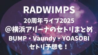 RADWIMPS20周年ライブ2025横浜アリーナ公演(11月22〜24日)のセトリ・セトリ予想・対バン3組(BUMP OF CHICKEN/Vaundy/YOASOBI)の披露曲を総まとめ。ツアー序盤の傾向から見える定番曲、日替わりポイント、各アーティストの対バンセトリ予想も詳しく紹介。座席情報・グッズ販売の注意点まで、参戦前に知っておきたい内容を1記事に凝縮!