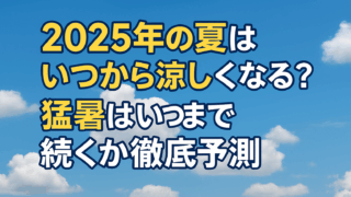 トレンド 2025今年の夏はいつから涼しくなる?猛暑はいつまで続くか徹底予測! 2025年の夏は例年より早く猛暑が始まり、9月も残暑が続く見込みです。気象庁の最新予報や記録的高温データをもとに、涼しくなる時期と暑さ対策を徹底解説します。10月中旬まで続く高温傾向や熱中症警戒情報も掲載。 2025.08.12 トレンド